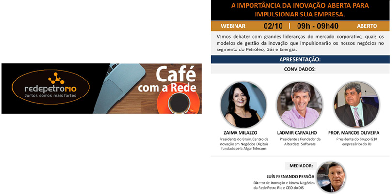 Evento RPR | CAFÉ COM A REDE e os convidados Zaima Milazzo, Presidente do Brain, Ladmir Carvalho, Presidente da Alterdata e Prof. Marcos Oliveira, Presidente do Grupo G10 | A IMPORTÂNCIA DA INOVAÇÃO ABERTA PARA IMPULSIONAR SUA EMPRESA. – nesta sexta-feira, 02/10/2020 – de 09h às 09h40 – PARTICIPE!!!