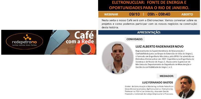 Evento RPR | Café com a Rede e Luiz Alberto Rademaker Novo da Eletronuclear | Eletronuclear: Fonte de Energia e Oportunidades para o Rio de Janeiro – nesta sexta-feira, 09/10/2020 – de 09h às 09h40 – PARTICIPE!!!