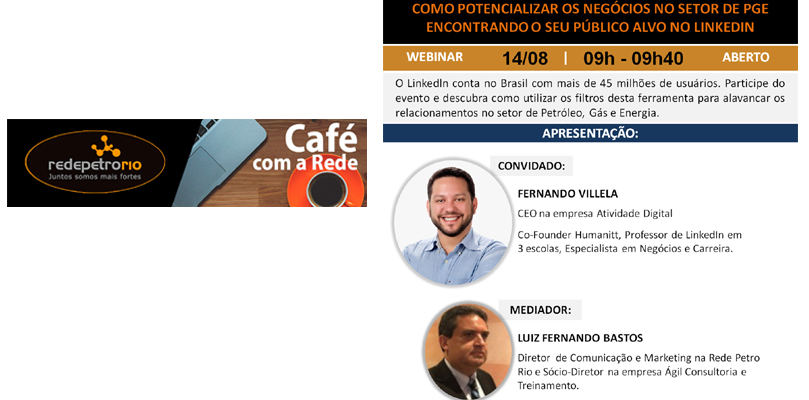 Evento RPR | CAFÉ COM A REDE e FERNANDO VILLELA da Atividade Digital, sobre COMO POTENCIALIZAR OS NEGÓCIOS NO SETOR DE PGE ENCONTRANDO O SEU PÚBLICO ALVO NO LINKEDIN – 14/08/2020 – de 09h às 09h40 – PARTICIPE!!!