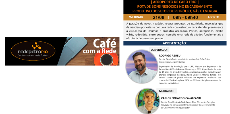 Evento RPR | CAFÉ COM A REDE e RODRIGO ABREU Diretor Geral do Aeroporto Internacional de Cabo Frio e International Logistic Center, sobre AEROPORTO DE CABO FRIO | ROTA DE BONS NEGÓCIOS NO ENCADEAMENTO PRODUTIVO DO SETOR DE PGE – 21/08/2020 – de 09h às 09h40 – PARTICIPE!!!