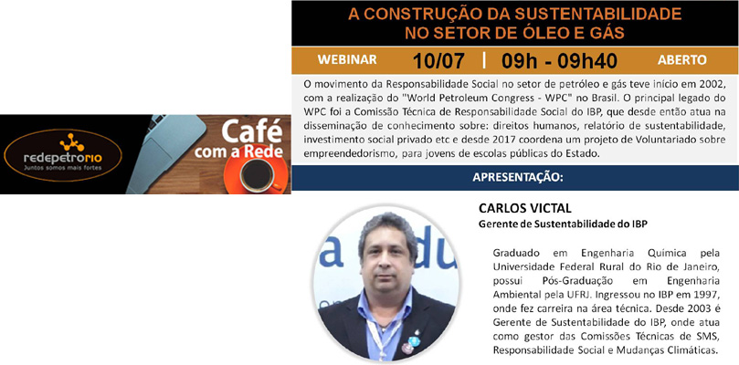 Evento RPR | CAFÉ COM A REDE e CARLOS VICTAL do IBP sobre A CONSTRUÇÃO DA SUSTENTABILIDADE NO SETOR DE ÓLEO E GÁS – NESTA SEXTA-FEIRA, 10/07/2020 – de 09h às 09h40 – PARTICIPE!!!