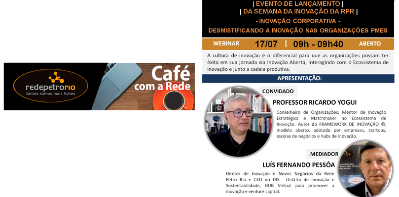 Evento RPR | LANÇAMENTO DA SEMANA DA INOVAÇÃO DA RPR no CAFÉ COM A REDE e Prof. RICARDO YOGUI (PUC, FDC) abordando o tema INOVAÇÃO CORPORATIVA – Desmistificando a Inovação nas Organizações PMES – NESTA SEXTA-FEIRA, 17/07/2020 – de 09h às 09h40 – PARTICIPE!!!