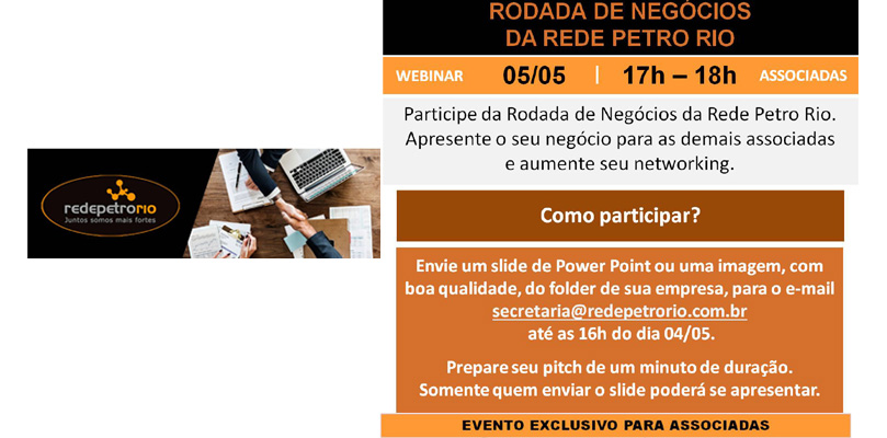 Evento RPR – Webinar para Associadas – RODADA DE NEGÓCIOS DA REDE PETRO RIO – 05/05/2020 – de 17h às 18h – PARTICIPE!!!